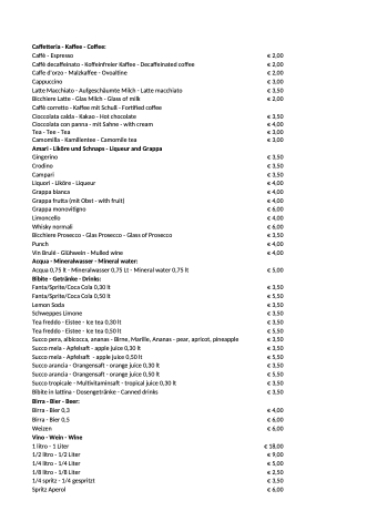 Cioccolata calda - Kakao - Hot chocolate Cioccolata con panna - mit Sahne - with cream Tea - Tee - Tea Camomilla - Kamillentee - Camomile tea € 3,50